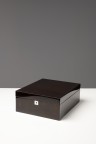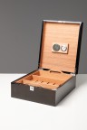 Cave à cigares Teck noirci laqué 9 couches Intérieur plaqué en bois de cèdre Serrure à clef et charnières chromées Plateau mobile pour cigares Higromètre Estampillée "LIAIGRE" 13,5 x 30 x 37 Dans son emballage d'origine.