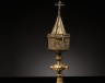 Ciboire en cuivre ciselé, gravé et doré. Réserve eucharistique de forme hexagonale ornée sur chaque face de scènes de la Passion sur fond quadrillé : Jésus au Jardin des Oliviers, la Flagellation, le Couronnement d’épines, le Portement de croix, la Crucifiion et la Résurrection ; toit conique avec rampants à crochets surmonté d'une Crucifiion ; tige à pans à deux nœuds aplatis et un nœud médian à cabochons losangiques émaillés des lettres de MARIA ; base polylobée. Allemagne du sud, vers 1410/1420 H 37,4 cm (petites restaurations notamment à la base du toit, légère déformation) Un ciboire avec une réserve eucharistique très semblable est conservé au Musée Civique d'Art Ancien de Turin (inv.979/B (voir Exposition Sienne 2002, Gotico sulle vie di Francia – Opere dal Museo Civico di Torino. Santa Maria della Scala, E.Pagella, cat. 16)