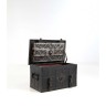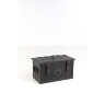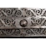 Coffre de Marine dit "de Nuremberg" en fer forgé et plaques de fer riveté à poignées tombantes latérales, facades ornées d'une fausse serrure et de serrure à moraillons. Le système de serrure à 12 pennes ornées d'une grande plaque à motifs feuillagés ajourés, avec un coffre intérieur