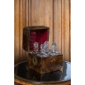 Coffret à liqueur en placage de loupe, gainé de laiton, poignées en forme de lyre. Travail Anglais du XIXe siècle Joint: quatre carafes avec leur bouchon (accidents) H 25 × L 21 × P 21 cm