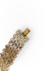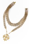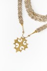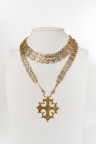 Collier articulé en métal doré à deux rangs de maillons ajourés, le plus long retenant en pampille une croix