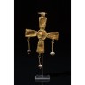 Croix en or, os, ambre et perles. Centre orné d'un cabochon ovale d'ambre, bras évasés sertis d'os incrusté de petite croix en or, pendentifs avec perles suspendues aux bras horizontaux et en partie basse, bélière moulurée. Art byzantin, Xe / XIIe siècle H 6 × H totale 8,5 × L 5,2 cm (petites oxydations, pierre possiblement remplacée anciennement) Provenance : ancienne collection privée, Angleterre
