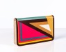 Pochette de toile écrue, le rabat décoré d'une mosaïque de cuir multicolore. Signé sur la griffe. (Fermeture à pression, bandoulière amovible) 17,5 × 28,5 cm Très bon état