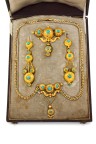 Elle comprend un collier, une broche et une paire de boucles d'oreilles "dormeuses" Travail de la première moitié du XIXe siècle Collier : 38 cm Broche : 4 x 4,5 cm BO : 6,5 cm Poids brut : 12,8 g Ecrin à la forme