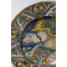 Deruta Plat rond en majolique à décor polychrome au centre d’un portrait d’homme casqué en buste de profil sur fond de paysage, l’aile décorée de rinceaux feuillagés et fleurons. XVIe siècle. D. 39 cm. Eclats