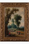 Promeneurs dans un paysage Panneau de chêne, non parqueté Hauteur : 46 cm Largeur : 30,5 cm Porte des inscriptions au revers du cadre à la craie blanche "François - ED" Restaurations anciennes EXPERT CABINET TURQUIN