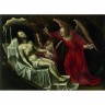 Ecole Italienne vers 1650, suiveur de Hans von Aachen Les anges au tombeau du Christ Toile 65 x 90 cm Sans cadre Notre tableau est une reprise de l’œuvre de Hans von Aachen (marbre noir, 16,5 x 22 cm) conservée dans le cloitre des Bénédictins à Kremsmünster en Autriche et dont il existe une autre version autographe sur toile (132 x 202 cm) conservée au château de Grignan (voir J. Jacoby, Hans von Aachen 1552-1615, Berlin, 2000, n° 24 et 25, reproduits fi. 52 et reproduit en couleur planche 8).