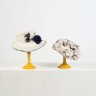 Ensemble de deux chapeaux, dont un avec des fleurs blanches et parme et pistils et l'autre en dentelle bleue et beige.