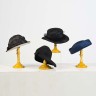 Ensemble de quatre chapeaux en paille, dont deux noirs, un bleu et un marron et beige.