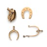 Ensemble de trois charms sur le thème de l'équitation en or jaune 18k (750‰) : fer à cheval, éperon et selle On y joint une broche "fer à cheval" (manque l'épingle) Poids : 34,3 g