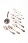 Un bougeoirs à main - poids 210 grs environ Trois couverts dépareillés et trois petites cuillères - Poids 460 grs environ Portent des poinçons XVIIIème