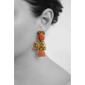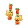 Paire de pendants d'oreilles articulés "Eléphants" d'inspiration indienne en or jaune 18k (750‰), diamants et émeraudes, suspendus par une tête de Bouddha en corail sculpté et retenant en pampille une fleur en corail sculpté