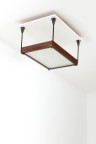 Plafonnier Fer forgé, bois et verre Modèle créé vers 1925 H 45,5 × L 82 × P 57 cm Bibliographie : 'Jourdain', A. Barré-Despond, Éditions du Regard, 1988, pour des projets de luminaires approchant pp. 279, 310