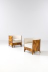 Paire de fauteuils Bois, placage de radica, laiton et textile Édition Magnoni et E. Quarti Modèle créé vers 1930 H 62×L 62×P 61 cm Provenance : Modèle créé pour la Villa Contini Bonacossi, Florence Expertisée par les Archives Gio Ponti