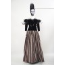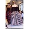 ROBE DU SOIR, corsage en velours de soie noir orné de plumes, jupe en taffetas façonné rayé gris à pois rouge