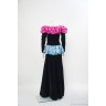 ROBE DU SOIR en velours de soie noir rehaussée de satin framboise et bleu à effet bouffant, bustier baleine intérieur