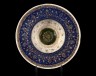 Grande assiette en émail peint polychrome et doré. Fond creusé en bol avec ombilic et large aile ; décor de rinceaux à feuilles de fougère sur émaux bleu, blanc et vert sombre avec rehauts de rouge et de bleu turquoise ; revers à fond blanc, aile et marli en émail bleu rehaussé d’étoiles, de petites couronnes et de frises de flurons. Venise, fi du XVe/début du XVIe siècle Ø 27 cm (infies usures à la dorure)