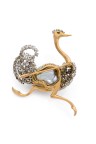 Grande broche animalière représentant une autruche en or jaune 18k (750‰ et platine, une importante perle baroque pour figurer le corps, des diamants ronds pour les plumes, une émeraude navette pour l'oeil