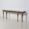 Grande console en bois peint et doré, le plateau de marbre blanc reposant sur une ceinture à frises de rosaces, les quatre pieds en balustre à guirlandes, mascaron, à cannelures rudentées. Italie du nord, fin du xVIIIe siècle H 87,5 x L 209 x P 47 cm