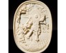 Grande plaque ovale en ivoire sculpté en profondeur représentant saint Jean dévorant le Livre, passage de l'Apocalypse (X, 8-10). L'ange tel que décrit par l'Evangéliste " vêtu d'une nuée, l'arc-en-ciel sur sa tête, sa face comme le soleil et ses pieds comme des colonnes de feu" donne à Jean agenouillé un livre ouvert, le pied gauche sur la mer, le droit sur la terre (à l'inverse des Ecritures) ; détails pittoresques fiement sculptés avec un port et tour fortifie sur la droite, arbre feuillagé sur la gauche, nuées percées de rayons lumineux à la partie supérieure ; bordure moulurée. Belle qualité d'exécution. Indo-portugais, fi du XVIe/début du XVIIe siècle H 13,5 × L 10 cm Sujet qui semble inédit sur les plaquettes indoportugaises. L'ivoirier semble s'être inspiré de la gravure sur bois de la célèbre série de Durer en l'inversant et en l'enrichissant de détails pittoresques (fi.).
