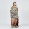 Grande Vierge à l'Enfant en pierre calcaire sculptée en ronde-bosse et polychromée. Debout, très légèrement déhanchée, la tête couronnée, elle tenait l'Enfant, aujourd'hui disparu, sur son bras gauche. Beau drapé du manteau revenant sur le devant tombant en plis étagés et enroulés sur la droite. Normandie ou Ile de France, vers 1340 Hauteur : 99 cm (Accidents et manques)