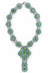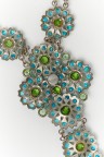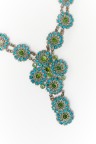 Collier en métal argenté à motif de fleurs ornées de cabochons vert et bleu Signé Un petit manque Longueur : 42 cm Dimensions du pendentif : 10 x 5 cm
