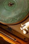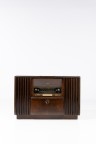 Bois laqué et laiton, radio à lampes, platine intégrée, haut-parleur