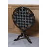 Guéridon tripode en bois noirci et doré à décor polychrome peint de fleurs, le plateau basculant présentant un damier à incrustations de nacre. Fin XIXe siècle H 62ר 61,5cm (Petits manques)