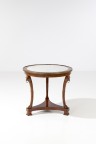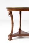 sur trois pieds à têtes de griffons retenant des anneaux. Base réunie par une entretoise. Plateau de marbre blanc veiné ceint d'une lingotière de laiton doré. Époque Empire H 73,5 × Ø 80,5 cm