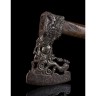 Hachette en fer forgé, repercé, ciselé et gravé. Décor composé d’un agencement de diverses fiures, masque de feuilles, animal au corps feuillagé, homme et femme, debout les jambes flchies ; tête ornée d’un côté d’une sirène à deux queues et d’un animal feuillagé de l’autre ; tranchant courbe. Manche en bois. Italie du sud, Naples ?, milieu du XVIIe siècle H 11,2 × L 7,6 cm L 34,2 cm (totale) (manche ancien rapporté) Cette rare hachette est un beau travail de ferronnerie. Le musée de l’Armée à Paris conserve dans ses collections un exemple comparable avec un fer orné du même type de personnage aux jambes flchies et monté avec un manche à système d’époque postérieure (Inv. K 73) (fi.).
