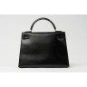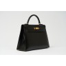 SAC "KELLY" Sellier 32 en box noir, garnitures métal plaqué or, cadenas et clés sous clochette anse bandoulière
