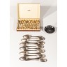 HERMES. Série de douze cuillères à moka contours filets dans leur boîte et série de 12 cuillères à entremets du même modèle. On joint un petit bougeoir bas. Le tout en métal argenté.