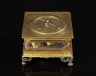Horloge de table de forme carrée en bronze gravé et doré reposant sur des pieds griffes ; écoinçons de la table à décor d'oiseaux entourés de rinceaux, fenêtres à ressauts sur les faces ; mouvement signé Michall Schulze Gedanni. Cadran au centre orné de couples dans un paysage champêtre avec Cupidon armant son arc, une aiguille en acier bleui, chiffres romains pour les heures ; mouvement avec coq ovale en laiton doré, ajouré et gravé d'entrelacs de fleurs, marteau orné d'un singe tenant une coupe, barillet, chaîne, fusée, échappement à verge ; sonnerie des heures. Pays germaniques, Michel Schulze Gedanni horloger, XVIIe siècle H 10,3 cm H (totale) 7,5 cm