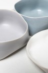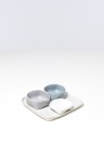 Ensemble de trois coupes et un plateau Pièces uniques Porcelaine émaillée Signées du cachet de l’artiste Date de création : 2006 H 2×L 21,5×P 20,5 cm H 2×L 9×P 9 cm H 4×L 9,5×P 9 cm H 4×L 10×P 9 cm