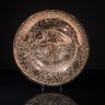 Important plat creux en faïence à reflts métalliques, lustre rouge cuivreux. Centre à décor d'un oiseau aux ailes déployées dans un entourage de végétaux ; sur l'aile, quatre oiseaux alternant avec des gros flurons sur fond de rinceaux. Au revers, importantes feuilles de trèfl et rameaux feuillagés. Valence ou Catalogne ?, XVIIe siècle Ø 42,5 cm (très légères égrenures et usures, cheveu infie) Ouvrage consulté : X. Dectot, Céramiques hispaniques (XIIe – XVIIIe siècle), Musée National du Moyen Age – Thermes et Hôtel de Cluny, Paris, 2007, cat, p 134-137.