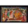 Inde du nord, dans le style du Haut Pendjab, XXème siècle Le dieu Krishna, assis sur une terrasse, jouant de la flûte, entouré de musiciennes sur la terrasse d'un pavillon Gouache sur papier 17 X 30 cm