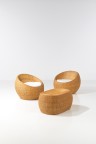 Paire de fauteuils et table basse Rotin et textile Modèle créé vers 1960 Fauteuil : H 69 × L 79 × P 84 cm Table basse : H 47 × L 90 × P 60 cm