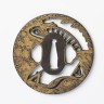 JAPON - Époque EDO (1603 - 1868) XVIIIe siècle Maru gata en fer à décor en maru bori d'une branche de prunier dans un cercle orné de six trous. Non signée. Ø 8,2 cm