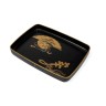Plateau de forme rectangulaire en laque noir décorée en hira maki-e et taka maki-e de laque or d'un masque de Nô et éventail. Avec sa boite