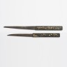JAPON - XIXe siècle Deux kozuka en shibuichi à décor en taka bori et incrusté de cuivre doré et argenté de Daikoku et pêcheur...
