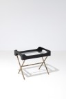 Table d'appoint à plateau amovible Laiton, cuir et verre Modèle créé vers 1950 H 55,5 × L 65,5 × P 45 cm Bibliographie : 'Jacques Adnet', A.-R. Hardy et G. Millet, Éditions de l'Armateur, 2009/2014, variante version porte-bagages p. 227