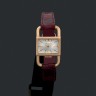 JAEGER LeCOULTRE pour HERMES. Modèle "Etrier". Montre de dame en or jaune 18K (750‰), cadran rectangulaire à fond argenté (légères salissures), index bâtons, mouvement mécanique à remontage manuel. Signée et numérotée 167581. Bracelet postérieur en cuir bordeaux à boucle ardillon métal. Poids brut : 20,9 g.