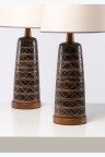 Paires de lampes de table Céramique, noyer, laiton et textile Édition Marshall Studios Étiquette de l'éditeur Modèle créé dans les années 1960 H 85 × Ø 48 cm