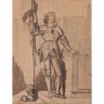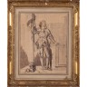 Ingres travaille entre 1843 et 1846 pour << Le Plutarque Francais : vies des hommes et femmes illustres de la France >>. On lui commande des << portraits >> en pied pour servir de frontispice aux biographies dont celle de Jeanne d'Arc. Etudiant les armures du XVème siècle, il produit de nombreux dessins préparatoires, comme le nôtre, pour une composition mettant en scène la sainte au sacre de Charles VII. Resté à l'état de projet, le Second Empire en passe la commande officielle qui sera livrée en 1854. Notre étude peut être rapprochée d'une autre à laquelle Ingres ajoute une jupe à la sanguine (dimension 50 x 38 cm).