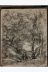 Cliché-verre (Delteil 58). Epreuve sur papier salé, essai pour l'édition de Maurice Le Garrec (Quarante clichés-glace de Corot - Daubigny - Delacroix - Millet - Rousseau tirés sur les plaques provenant de la Collection de M. Cuvelier, Paris, 1921). Importante mouillure à gauche et manque en haut à droite.