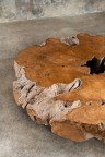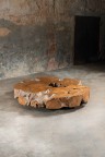 Table basse Pièce unique Loupe de teck et acier inoxydable Monogrammée ‘JAS’ sur la tranche du plateau Date de création: 2025 H 37 × Ø 190 cm