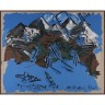 Rapport de condition : Oeuvre encadrée. Petits manques épars dans le bleu vers la bordure inférieure. Marque du châssis visible le long de la bordure gauche. Bon état général. Pas de défaut de structure apparent.