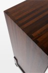 Bois lamellé collé, mélaminé noir, étagères en masonite et acier à patine canon de fusil