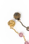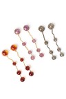 Trois paires de clips d'oreilles en métal doré ou métal argenté noirci formés d'une branche stylisée intercoupée de perles de verre gris pour l'une, ambre pour l'autre et violet pour la dernière Deux paires signées Dimensions : 13 x 2,5 cm