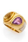 Années 1980-90 Bague chevalière de dame en or 18k (750‰) de deux tons, ornée d'une citrine et d'une améthyste poire Signée, gravée 750 Tdd : 55 Poids brut : 17,63 g